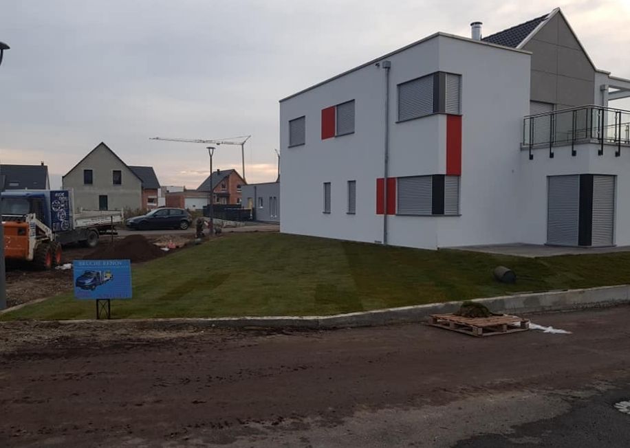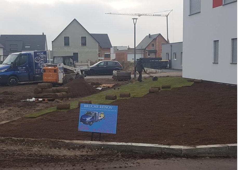 Exemple d’aménagement paysager avec terrassement et pose de gazon à Hoerdt