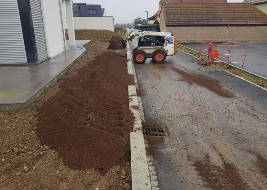 Aménagement paysager avec terrassement du sol et plantation de gazon à Hoerdt
