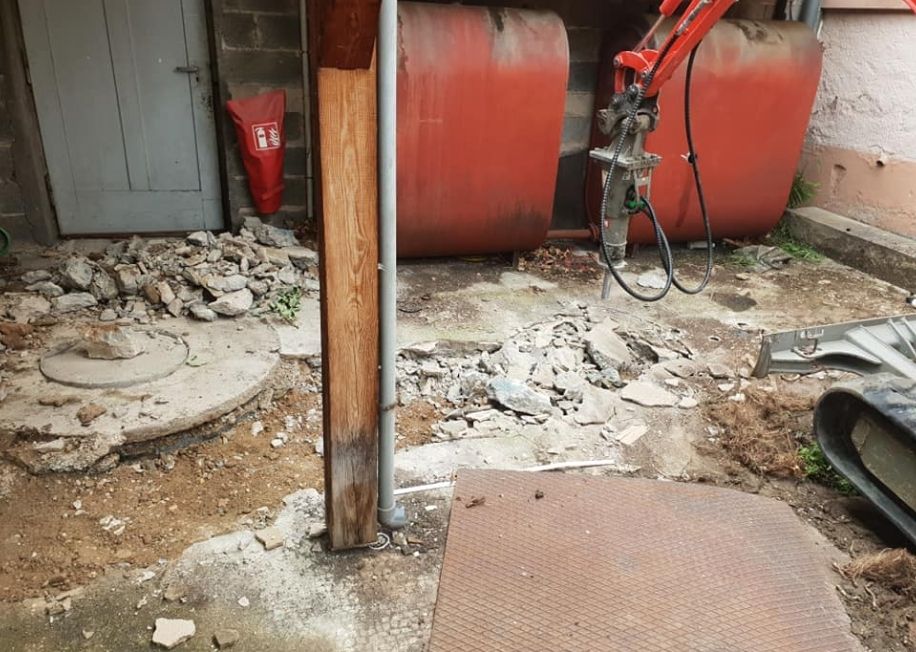 Dans l’ancien local Carrefour à Urmatt, Plénitude Rénovation a réalisé un chantier complexe comprenant le décaissement, la démolition et la création d’une nouvelle dalle béton. L’objectif était de modifier l’écoulement des eaux dans un préau sans accès direct au sol. Une mini-pelle a été acheminée par les airs afin de permettre l’exécution des travaux. Ce projet, d’une durée d’une semaine, illustre notre savoir-faire dans la gestion des chantiers techniques et des accès restreints en milieu professionnel.